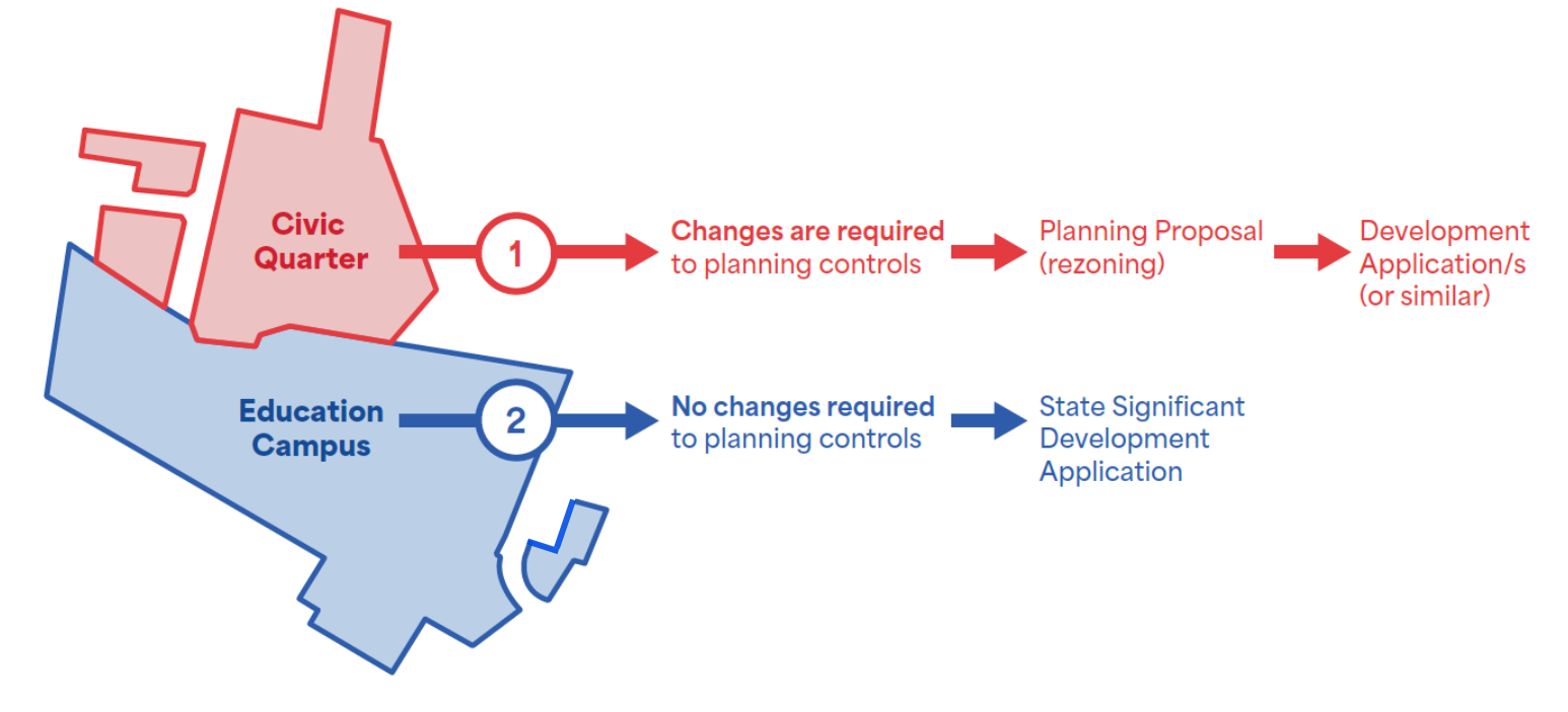 To bring the vision and Masterplan to life, some changes will be required to current planning controls. NSW planning laws require two different planning pathways.