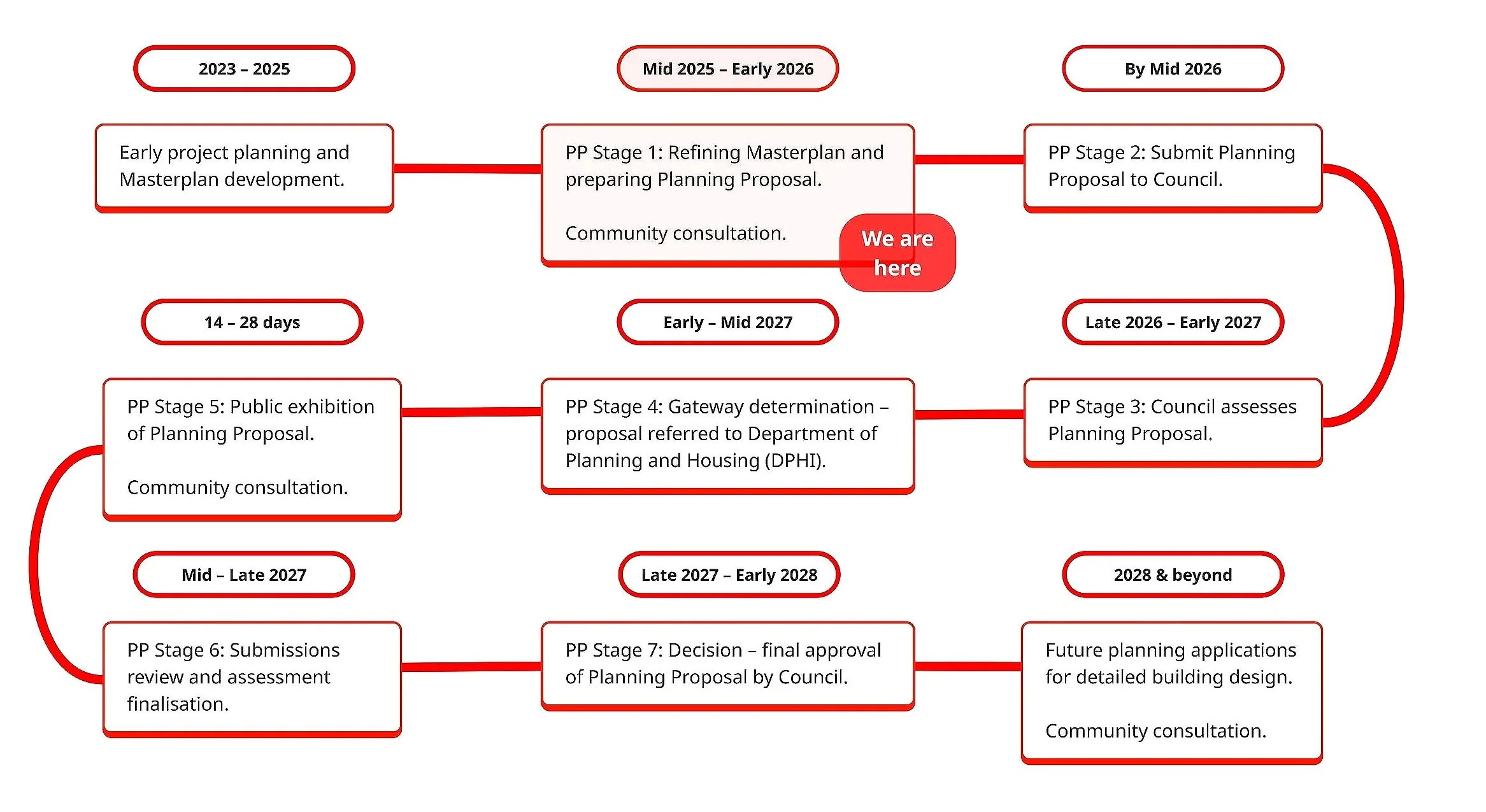 The Planning Proposal diagram shows where we are in this process. At this stage, we aim to submit our Planning Proposal to Council by mid-2026.
